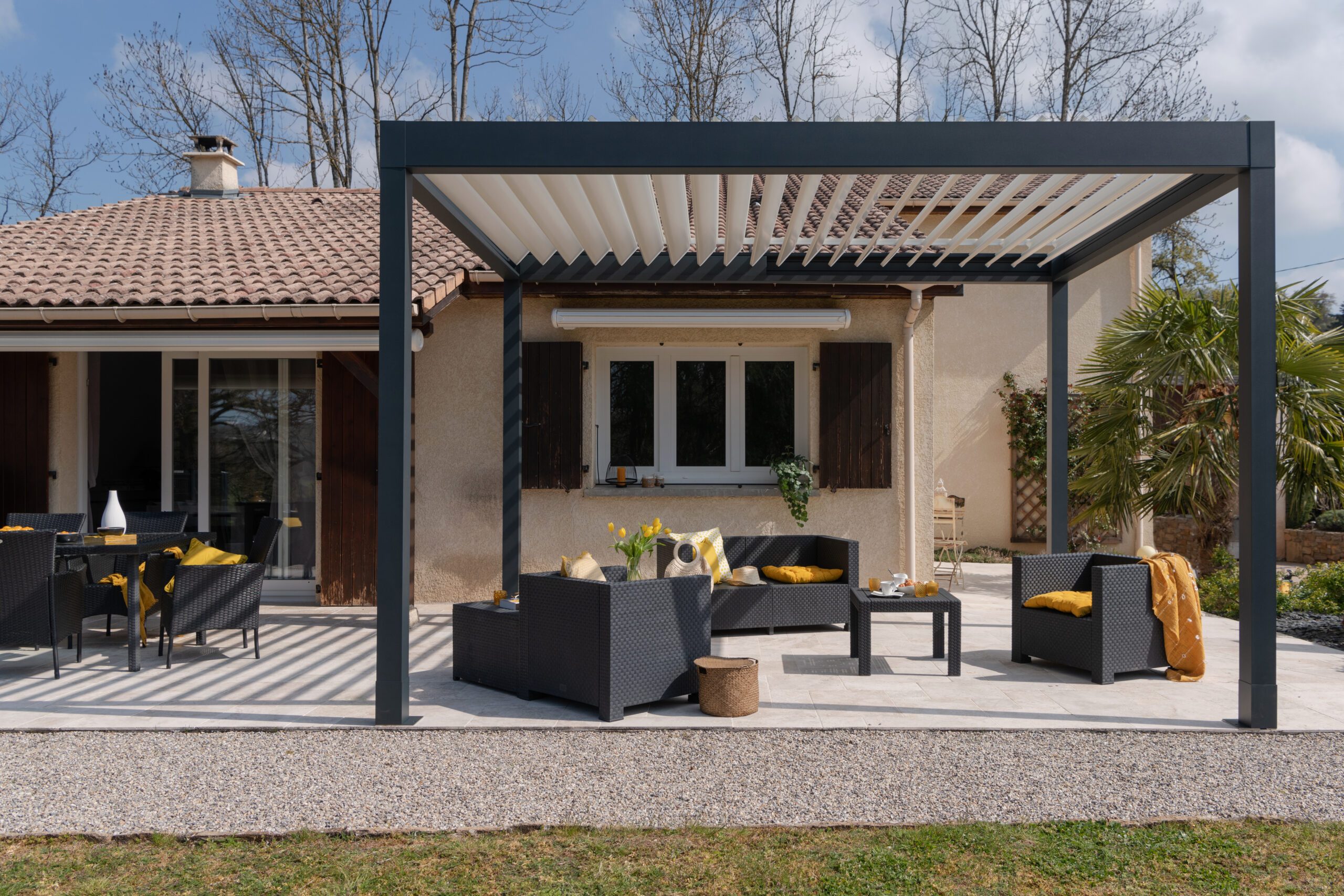 - Le toit à lames orientables qui vous protège du soleil et de la pluie. Quoi qu’il arrive les lames bioclimatiques sont étudiées pour vous apporter du confort.