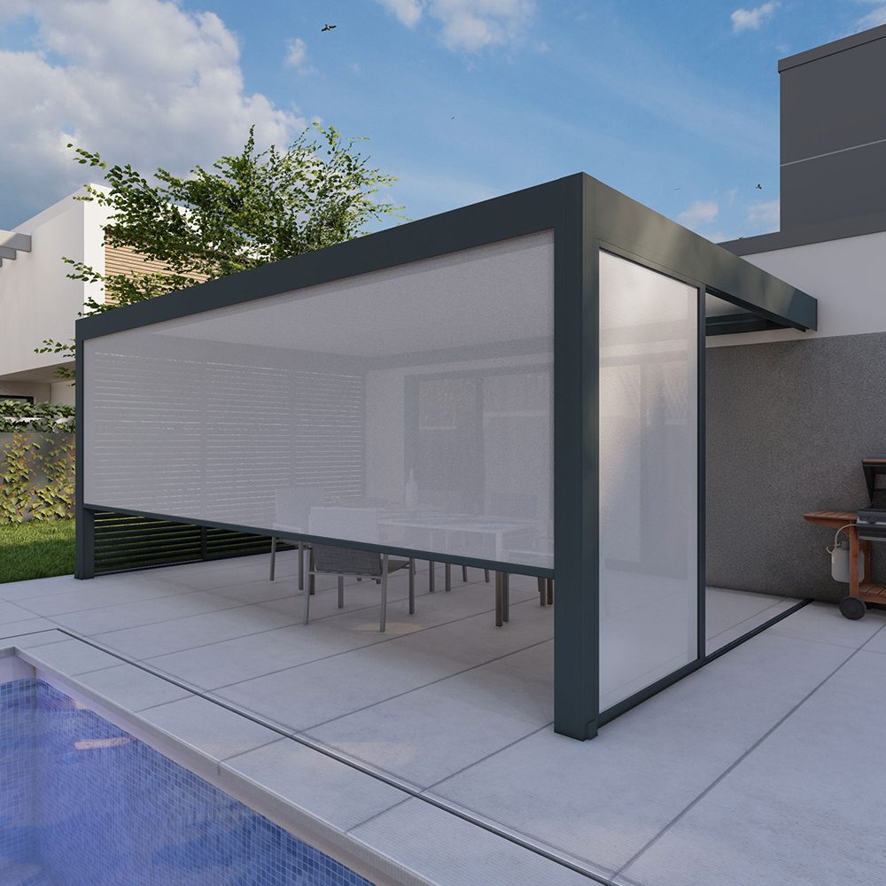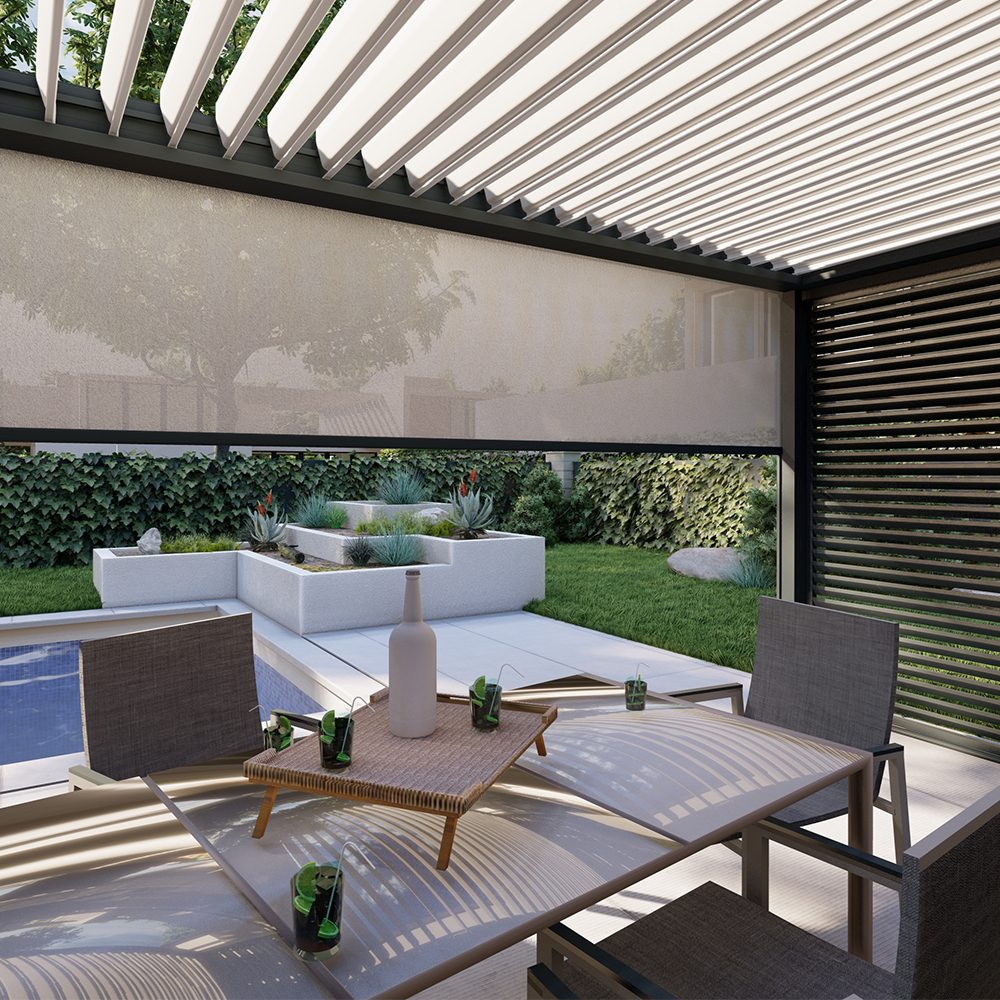 La toile Serge Ferrari Veozip vous protège également du vis-à-vis tout en vous permettant de profiter de la vue de votre jardin. Ainsi, confortablement installé sous votre pergola, vous êtes à l’abri des regards tout en profitant de votre panorama.
